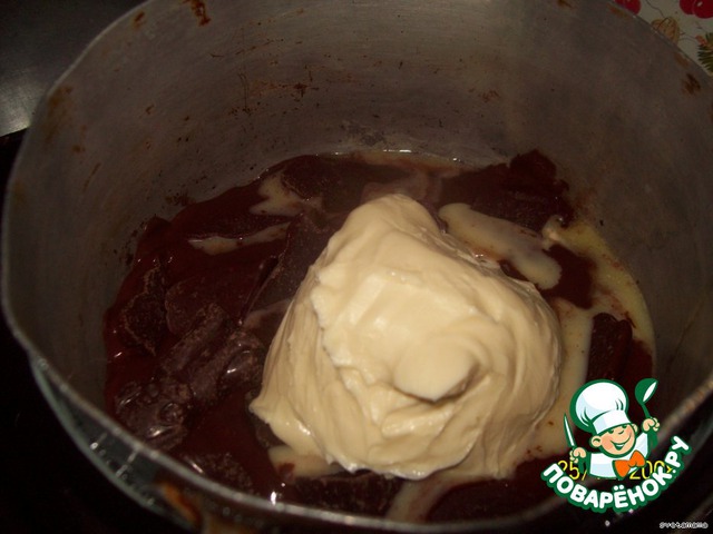 Шоколад ломаем на кусочки (у меня шоколадные фигурки), добавляем масло и растапливаем в микроволновке на полной мощности 2 мин. или на водяной бане с не сильно кипящей водой, периодически помешивая. слегка остудить.