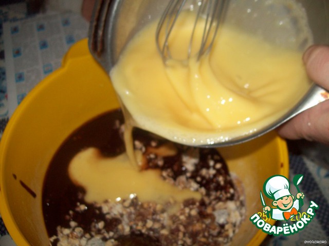 В сухие ингредиенты добавляем шоколад и взбитые яйца, не забываем про патоку или мед (и другие их заменители).