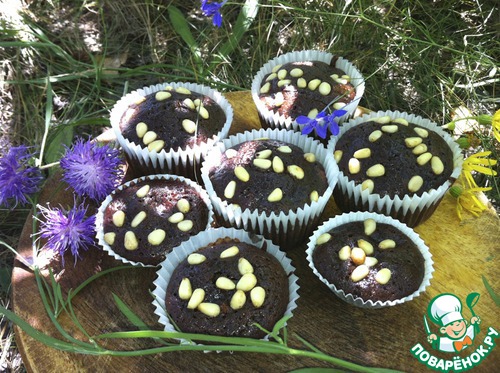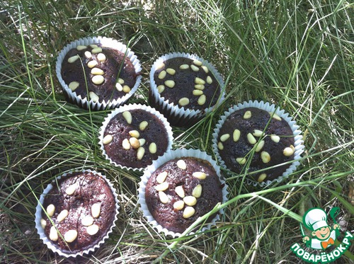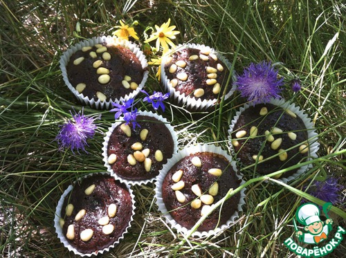 Формочки заполнить на 2/3 высоты, сверху посыпать поджаренными кедровыми орешками.