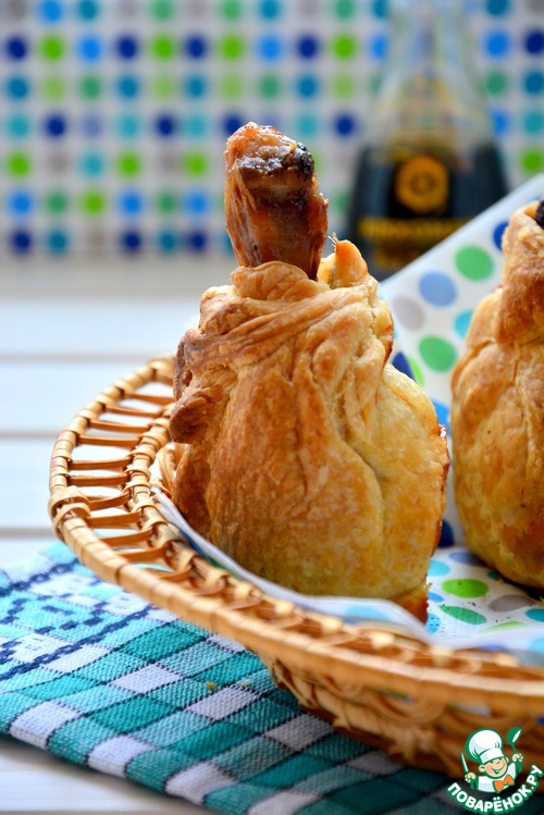 На каждый пласт теста в центр выложить немного овощной смеси, затем куриную голень