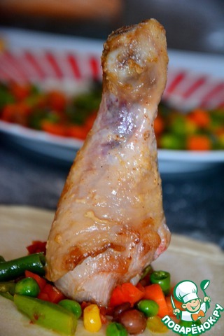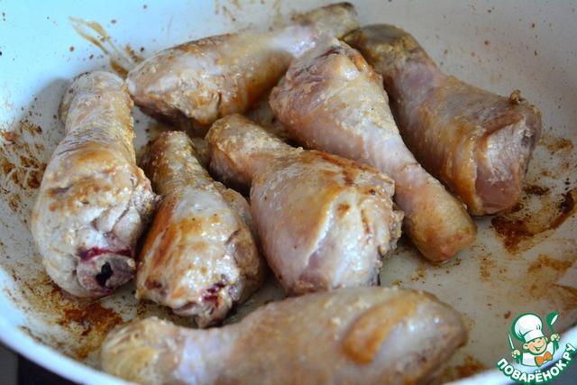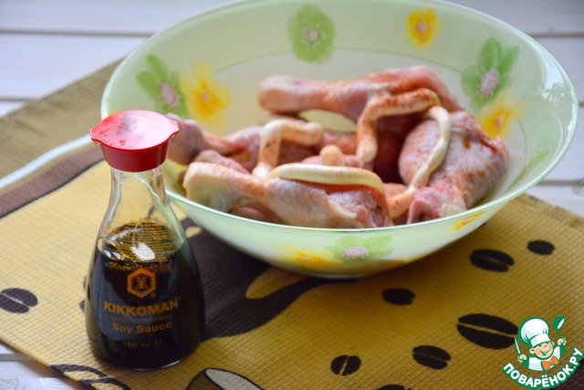 Для начала нужно замариновать куриные голени в соевом соусе и майонезе (добавить паприку). Дать помариноваться часок