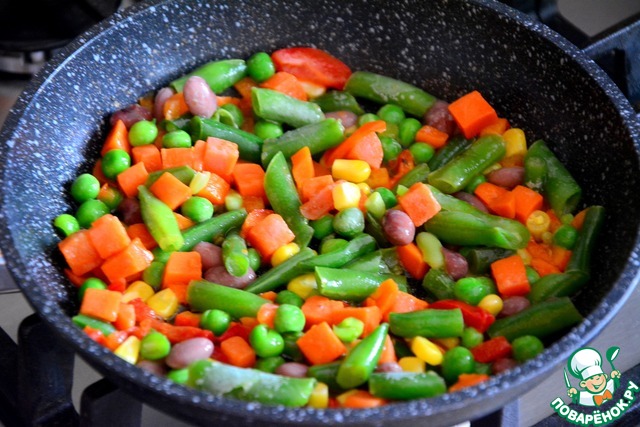 Тем временем обжарить готовую овощную смесь на растительном масле (смесь можно взять по своему вкусу). Посолить по вкусу и дать остыть.