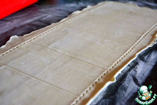 Готовое слоеное тесто разморозить, немного раскатать скалкой и разделить на 7 частей