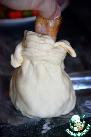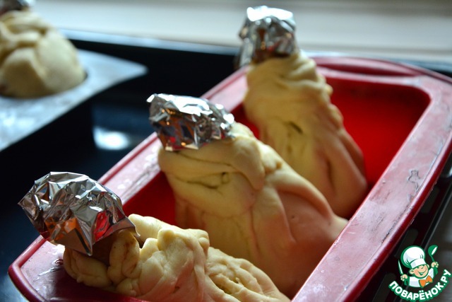 Подтянуть тесто наверх. Обрезки теста использовать вместо жгутиков-завязочек