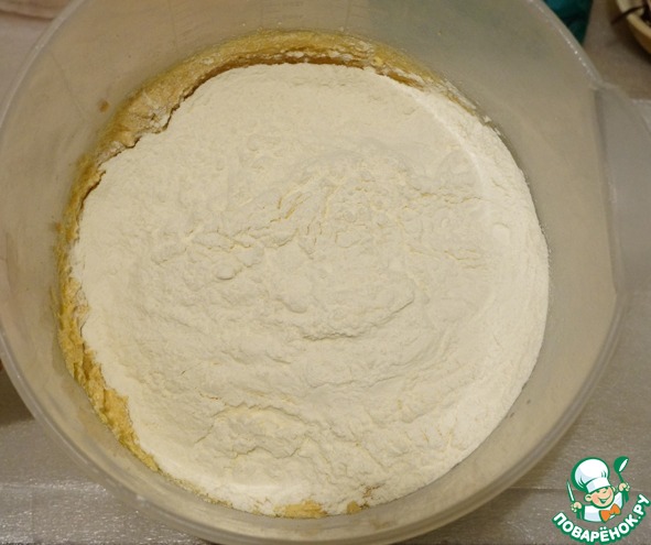 Добавить муку и разрыхлитель (у меня мука самоподнимающаяся, я не разрыхлитель не добавляла), слегка перемешать.