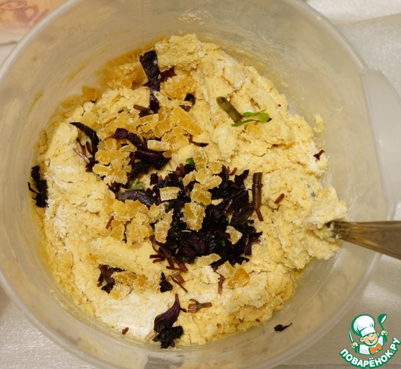 Добавить нарезанные имбирные цукаты и базилик. Быстро замесить тесто.