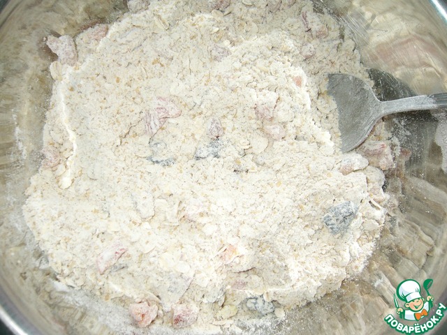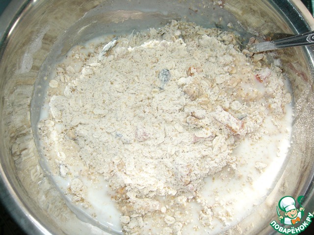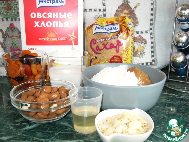 В миску всыпать муку, смешанную с разрыхлителем, корицу, измельчённый миндаль, овсяные хлопья, не требующие варки, ТМ"Мистраль"