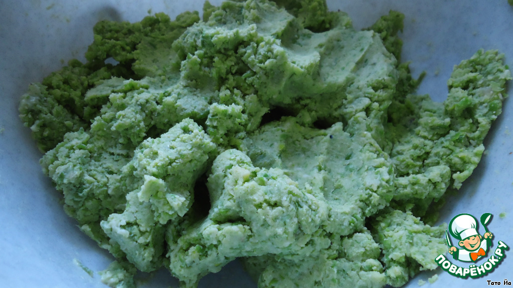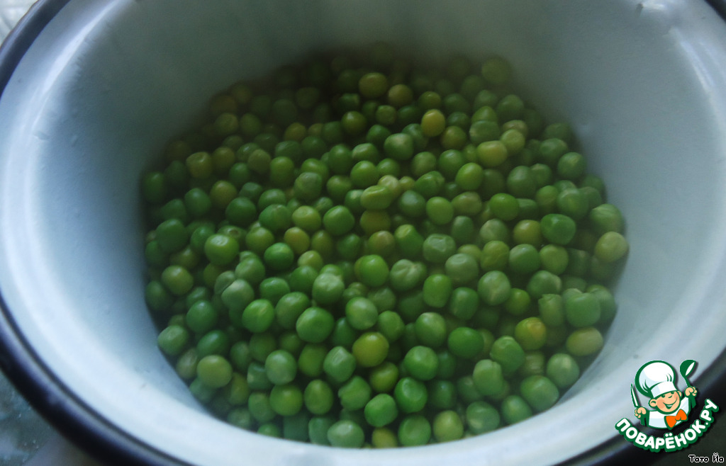 Сначала займемся начинкой. Свежий горошек очистим и обмоем. Всыпаем в кипящую воду, доводим до кипения, считаем до 10 и откидываем на дуршлаг. Оставляем остужаться.
