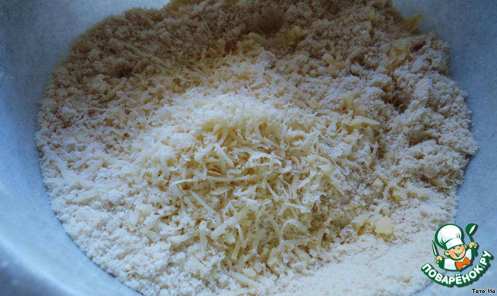 При помощи ножа или вилки рубим холодное масло вместе с мукой, чтобы получились мелкие крошки; добавляем половину сыра, натертого на мелкой терке.