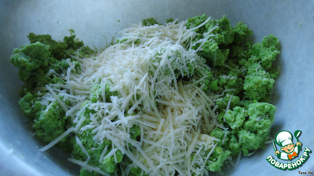 С помощью блендера превращаем горошек вместе со сливками в пюре. Добавляем оставшийся сыр и специи (соль, перец, паприка, мускатный орех).
