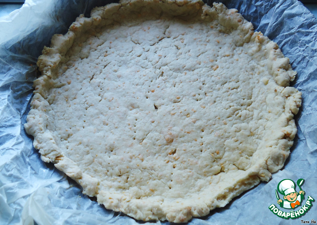 Готовое тесто аккуратно раскатываем и укладываем в форму. Делаем форму с бортиками. У меня форма около 24 см в диаметре. Накалываем в нескольких местах и выпекаем форму 20 мин. при 180°С.