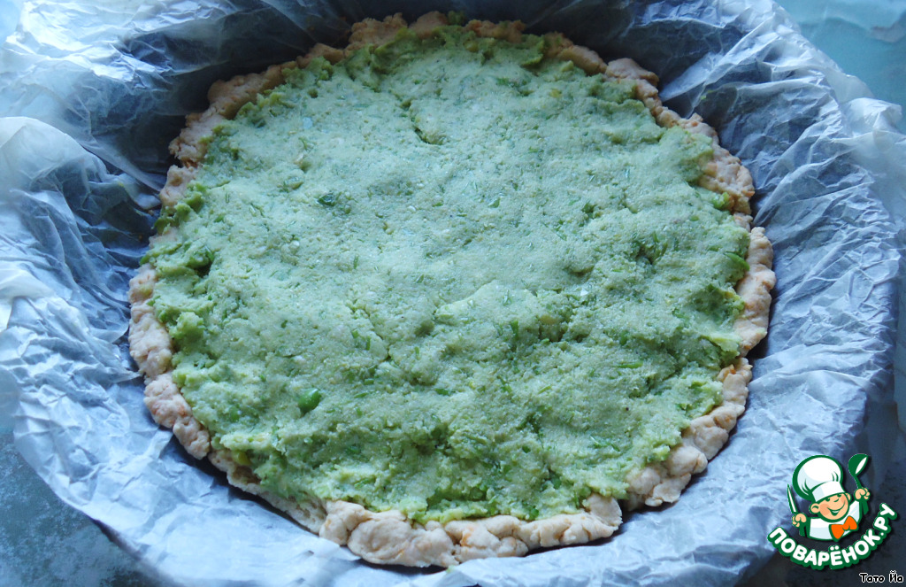 Выкладываем начинку из горошка в основу для пирога, возвращаем в духовку, выпекаем еще 15 мин.