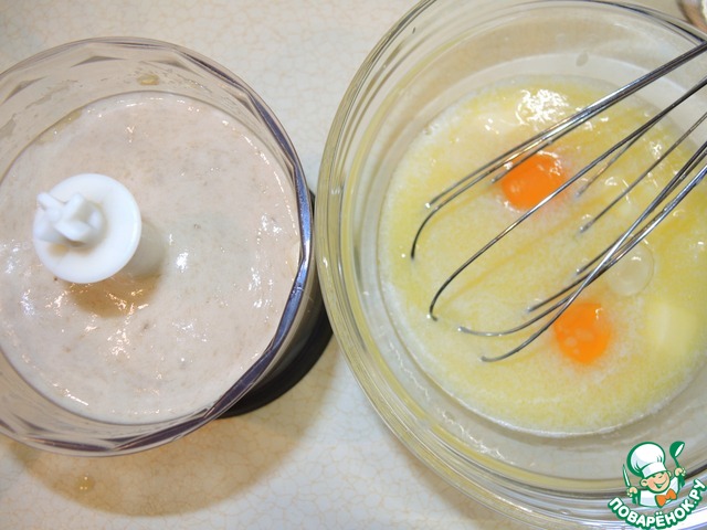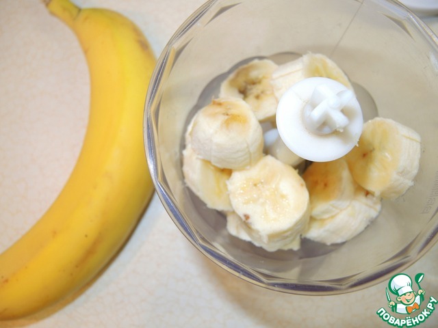 Смешать венчиком в емкости 2 яйца, размягченное сливочное масло и банановое пюре. Бзбивать в миксере не нужно.