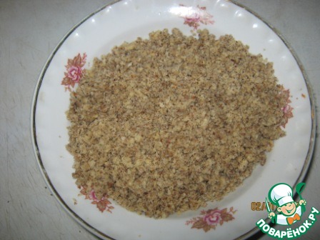 Орехи перекрутить через мясорубку (можно конечно и потолочь, но корж будет разваливаться)
