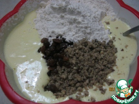 Теперь добавляем в яйца орехи, изюм, муку и гашенную соду.