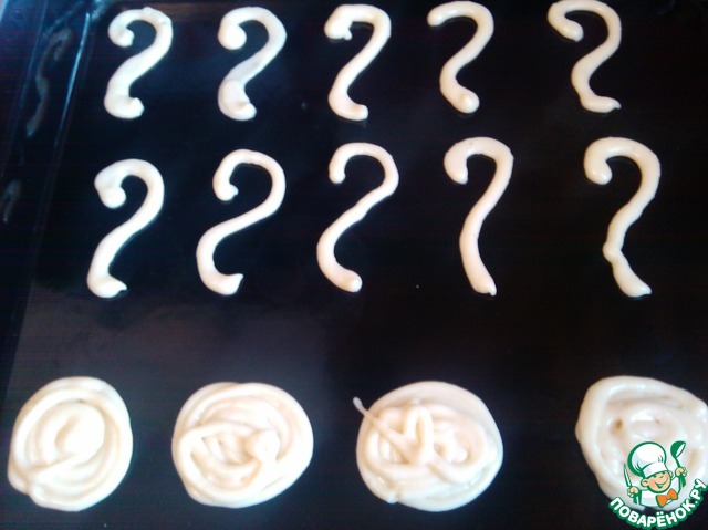 Теперь берем кондитерский мешок, складываем в него тесто и отсаживаем шеи и туловища наших будущих лебедей. Выпекаем при 200 градусах