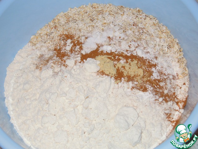 Смешать сухие ингредиенты: муку, овсяные хлопья, корицу, мускатный орех, ванилин, разрыхлитель, имбирь, соль и соду.