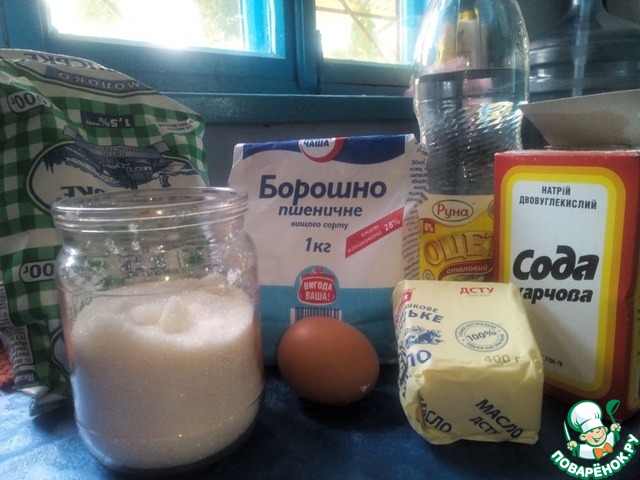 Вот все, что нам понадобится. Готовила коржики на даче, поэтому вместо разрыхлителя у меня была сода, гашеная уксусом.
