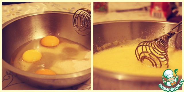 2. В отдельной миске взбейте яйца с сахаром в течение 3 минут, пока смесь не побелеет и не вспенится.