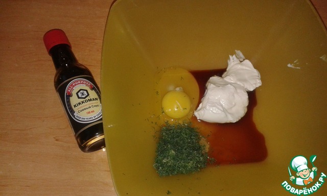 В миску разбить яйцо, добавить сметану, соевый соус, мелко нарезанный укроп