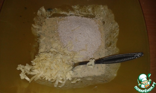 Все перемешать, добавить измельченные овсяные хлопья и натертый сыр