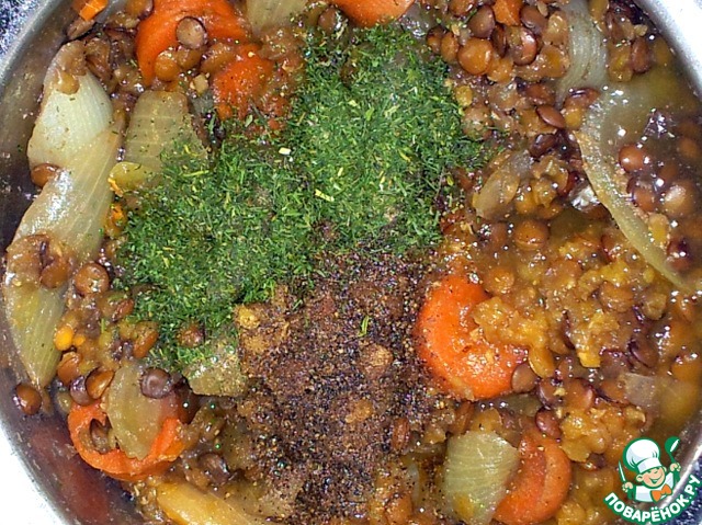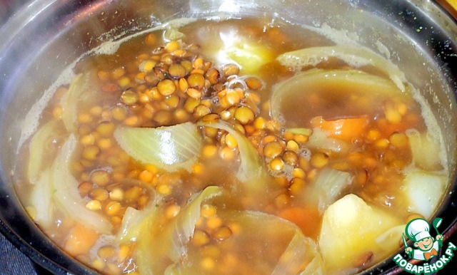 В бульоне, который остался после индейки я сварила лук, морковь и чечевицу.