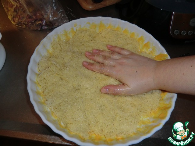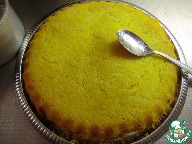 Берём тарелку или блюдо, накрываем форму и переворачиваем. (Можно и не переворачивать. Это тоже зависит в какой восточной стране делают кунафу. Мои студентки иракские курды не переворачивали и не выравнивали тесто.)
