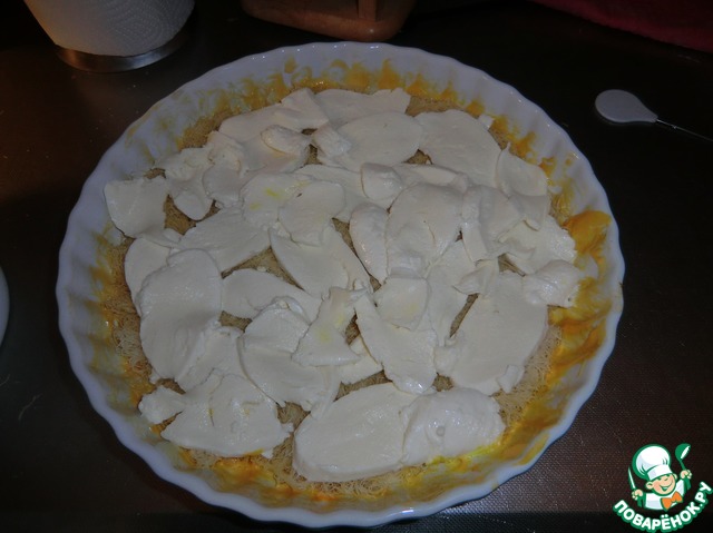 Моцареллу и рикотту выкладываем на тесто. (На фото только моцарелла. Я решила сначала делать только с этим сыром, но попробовав решила что с добавлением рикотты будет намного вкуснее.)