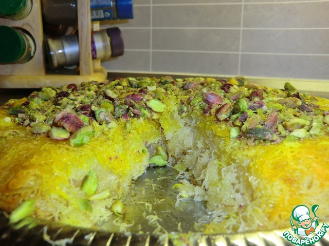 | Моё знакомство с этим блюдом произошло далеко не в восточной стране, а в западной - в Швеции. Мои иракские студенки готовили эту сладость на праздники. Тонкие нитки теста, сыр, фисташки и сладкий сироп - о чём можно ещё мечтать? Закрываешь глаза и попадаешь на арабский пир... |
