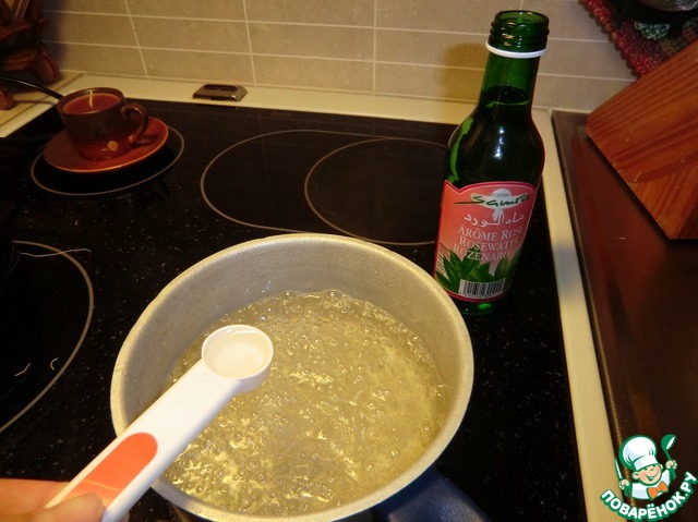 Начинаем делать сироп. В воду ложим сахар и помешивая доводим до кипения. Когда сироп начнёт кипеть, убавляем огонь и даём покипеть ещё 10-15 минут. Затем вливаем лимонный сок и розовую воду. Дать сиропу остыть.