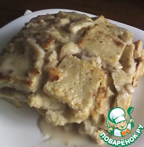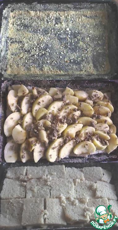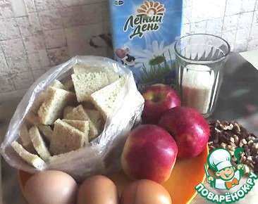 Тем временем хорошо смазываем противень, посыпаем его сухарями. Выкладываем половину смоченных ломтиков хлеба, сверху яблоки, посыпаем измельчёнными орехами и накрываем всё это оставшимся слоем смоченных ломтиков (сверху придавливаем руками или досочкой). Ставим в разогретую духовку примерно на 15 минут (до золотистой корочки).