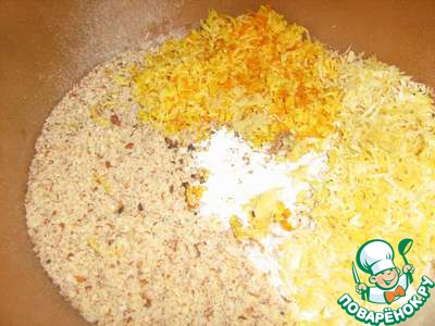 Смешать в большой миске муку с молотым миндалем, разрыхлителем, пищевой содой, пряностями, цедрой лимона и апельсина.
