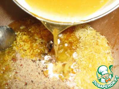 Растопить на плите масло с медом. Влить в сухие ингредиенты и перемешать до образования достаточно тугого теста.