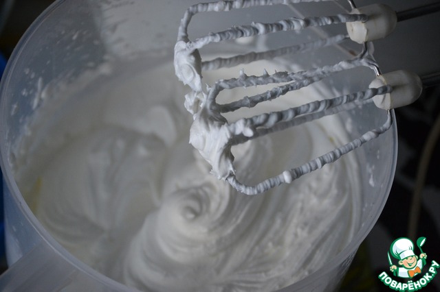 Пока коржи полностью остывают, взбиваем сливки, постепенно добавляя сахарную пудру. (можно добавить загуститель для сливок)