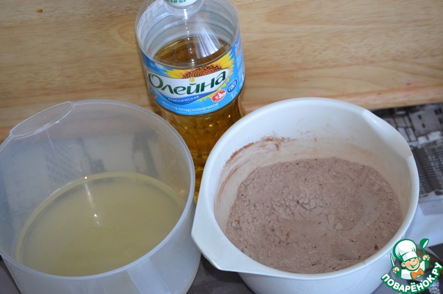 Смешаем муку, какао, соду и соль. в отдельной миске смешаем сахар, масло Олейна воду, сок лимона и кофе. Взбиваем, пока сахар полностью не растворится.
