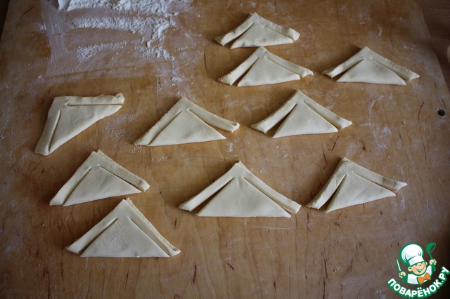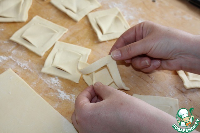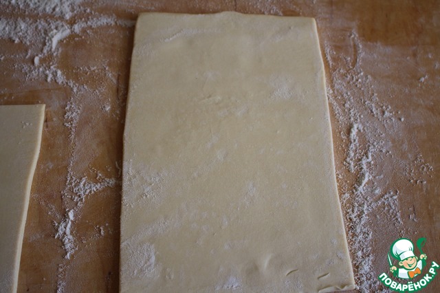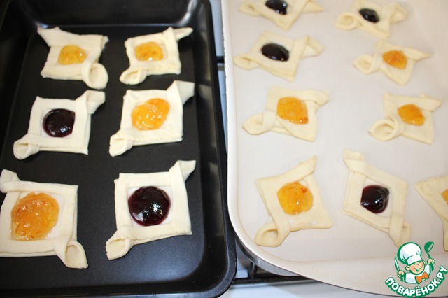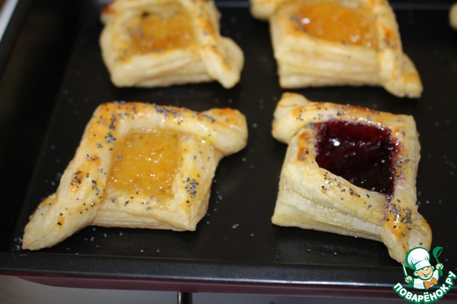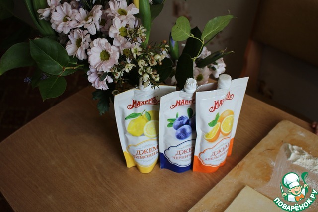 Я использовала готовое слоеное тесто, предварительно размороженное на припыленной мукой доске. Для начинки купила джемы торговой марки "Махеев": апельсиновый, черничный и лимонный.