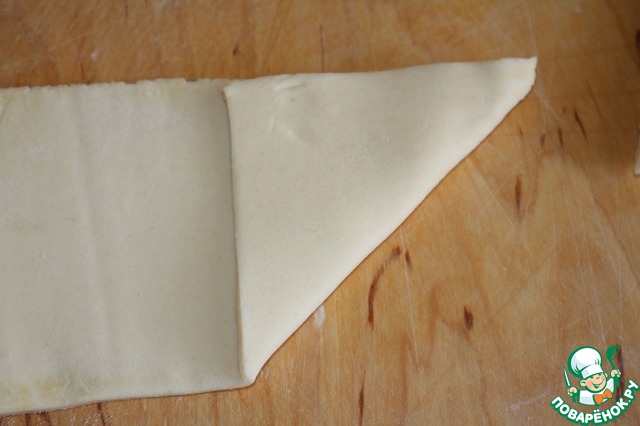 Итак, раскатываем лист мягкого теста до толщины 0,5 см. Делим его вдоль на 2 полосы.