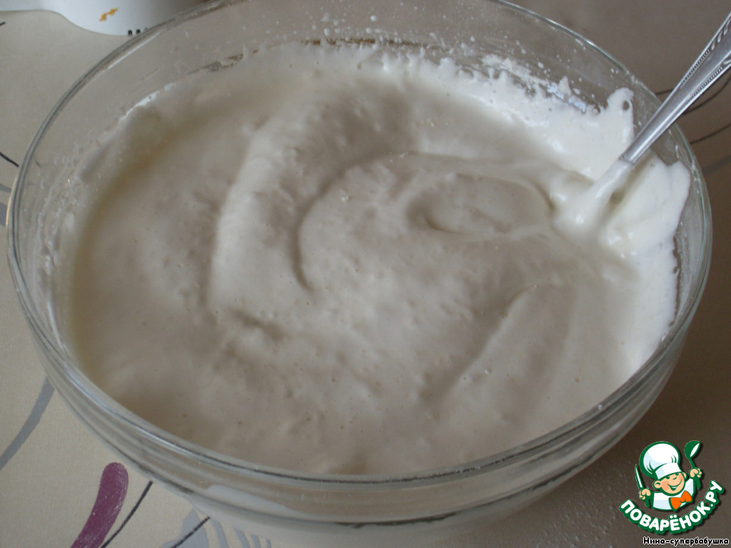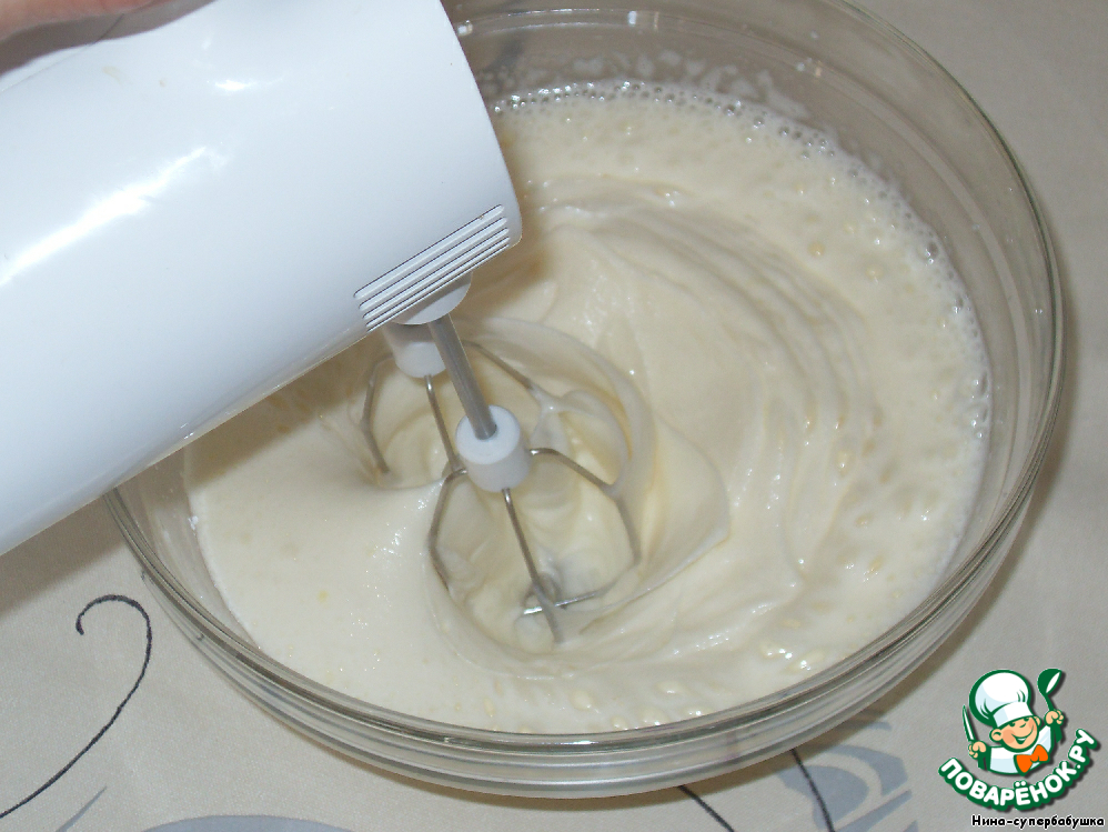 Яйца взбить с сахаром и ванилином или ванильным сахаром в густую пену.