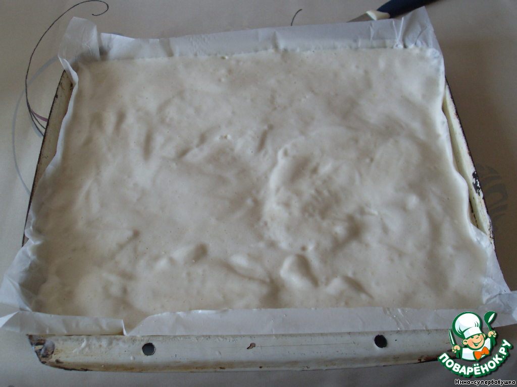 Противень заранее застелить пекарской бумагой и смазать ее маслом. Вылить тесто и разровнять. У меня все тесто не поместилось. Осталось немного.