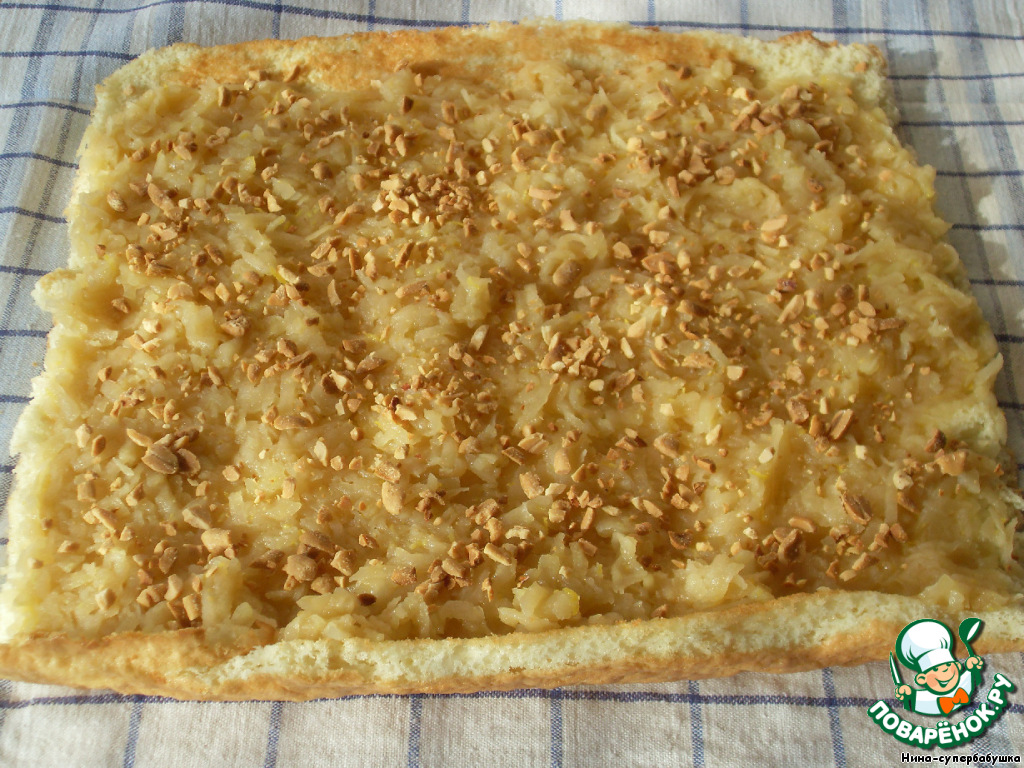 На корж равномерно выложить начинку, сверху посыпать обжаренными и измельченными орехами.