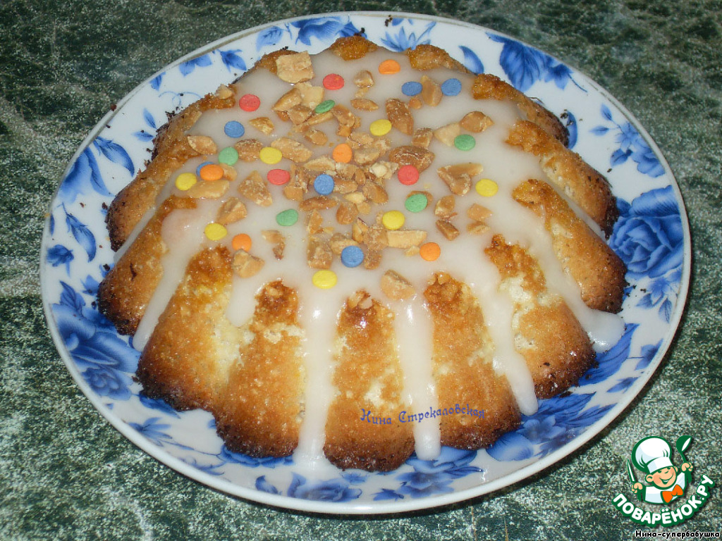 Из оставшегося теста я испекла небольшой кексик и украсила лимонной глазурью, орехами и кондитерской посыпкой.