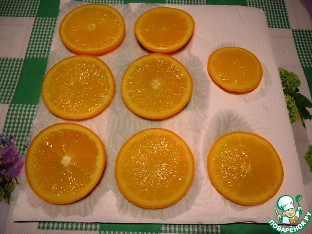 Достаем апельсиновые ломтики и укладываем на бумажное полотенце для удаления лишней жидкости.
