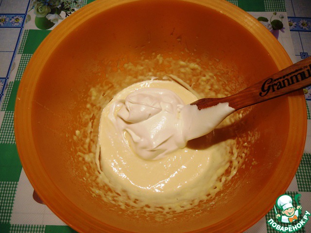 К желтковой массе добавляем 1/3 часть взбитых белков, аккуратно перемешиваем лопаткой.