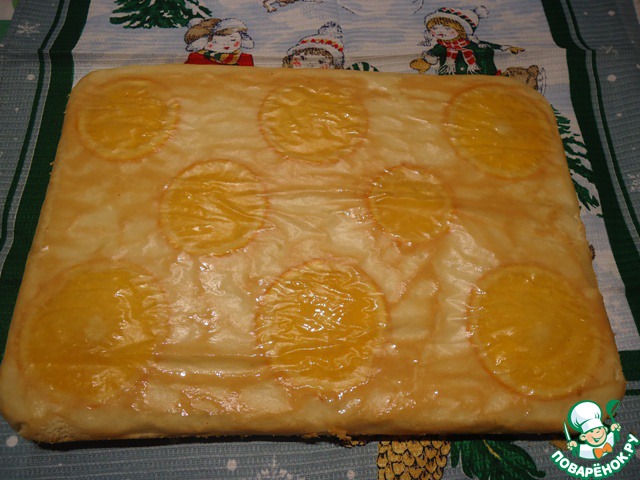 Тесто выливаем в противень с апельсиновыми ломтиками
