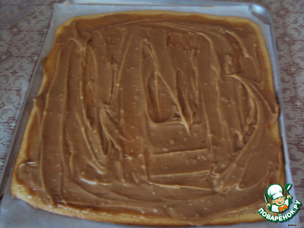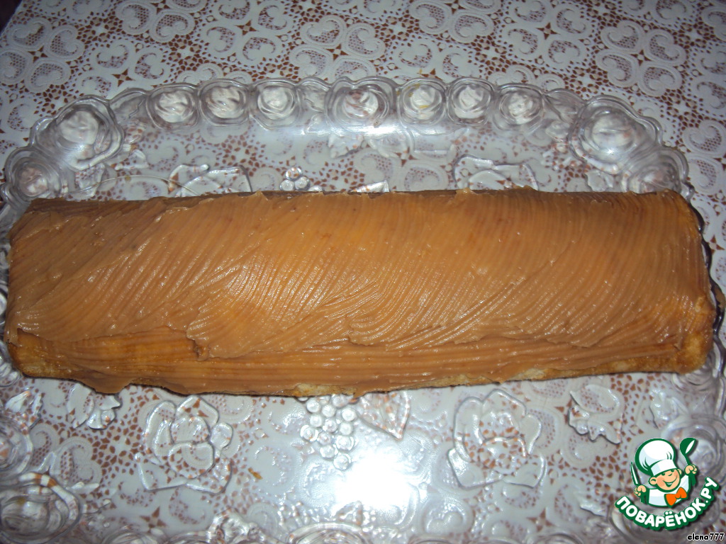 Я промазала свой рулет заварным кремом "Ириска", его приготовление смотрите здесь http://www.povarenok.ru/recipes/show/47161/ ,