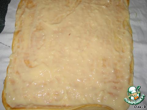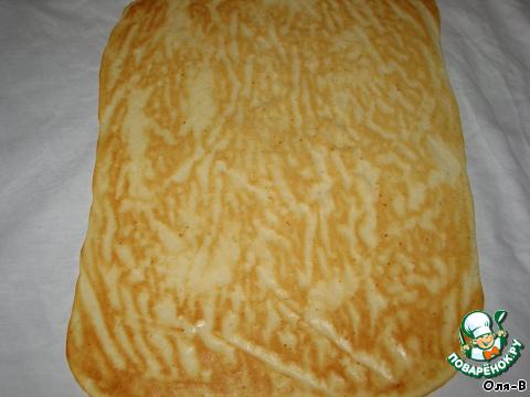 Поставить в духовку, выпекать 5 - 7 минут, печется быстро. Готовый корж перевернуть на чистое полотенце или ткань, аккуратно снять бумагу.