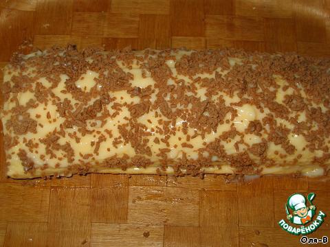 Затем снова свернуть, верх и бока так же смазать кремом, хорошо посыпать орехами. Убрать в холодильник на несколько часов, чтобы рулет застыл и пропитался.