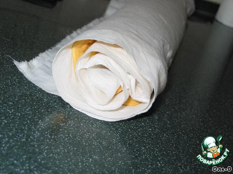 Затем рулет свернуть вместе с тканью, оставить так минут на 10-15.