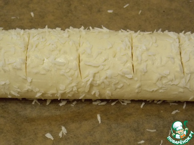 Свернуть рулетом. Положить на застеленный противень швом вниз. Смазать верх водой и посыпать отложенным кокосом. Сделать насечки наверху, Вам будет легче потом разрезать.