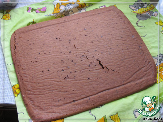 Корж испекся (спичка вынимается сухая). Переворачиваем его на влажное полотенце (вот тут начались проблемы... он ломался), снимаем бумагу.